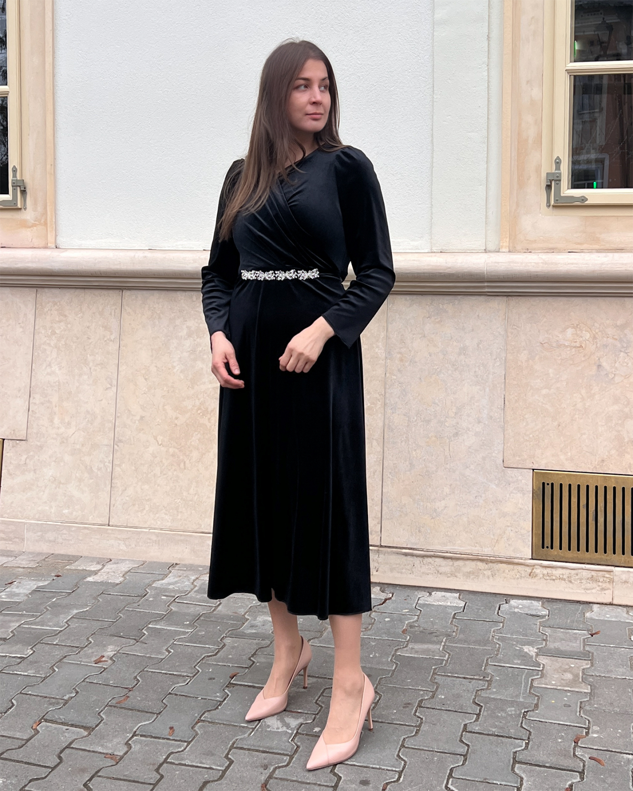 rochie Wistful black AROER Studio, realizată din material de catifea fluida, cu croială feminină și detalii rafinate în talie. Un design atemporal, potrivit pentru evenimente speciale, seri elegante sau apariții sofisticate. Rochia evidențiază silueta prin linii curate și finisaje premium, fiind alegerea ideală pentru femeia modernă care apreciază simplitatea cu impact.